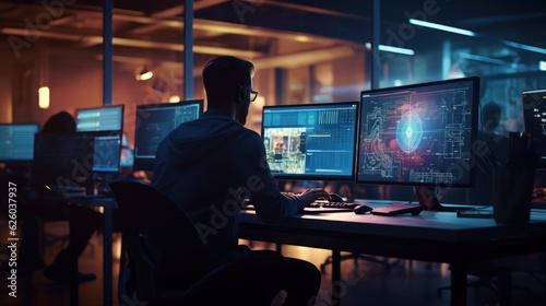 Wall mural a scene showcasing a team of software developers coding, collaborating, and testing applications in  - Wall murals Wall mural a scene showcasing a team of software developers coding, collaborating, and testing applications in - Wall murals