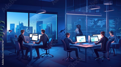 Wall mural a scene showcasing a team of software developers coding, collaborating, and testing applications in  - Wall murals Wall mural a scene showcasing a team of software developers coding, collaborating, and testing applications in - Wall murals