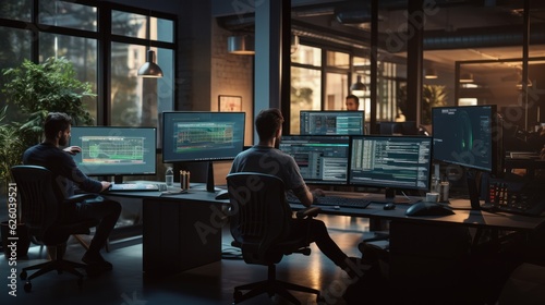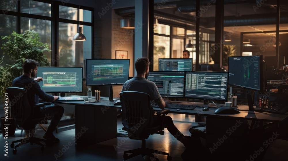 Wall mural a scene showcasing a team of software developers coding, collaborating, and testing applications in  - Wall murals Wall mural a scene showcasing a team of software developers coding, collaborating, and testing applications in - Wall murals