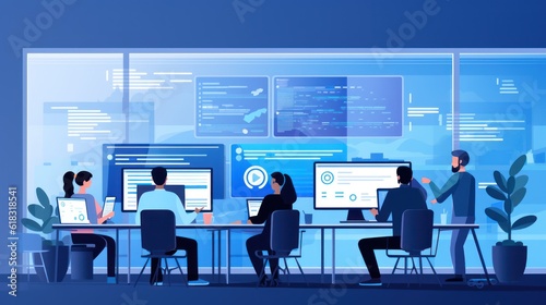 Wall mural a scene showcasing a team of software developers coding, collaborating, and testing applications in  - Wall murals Wall mural a scene showcasing a team of software developers coding, collaborating, and testing applications in - Wall murals
