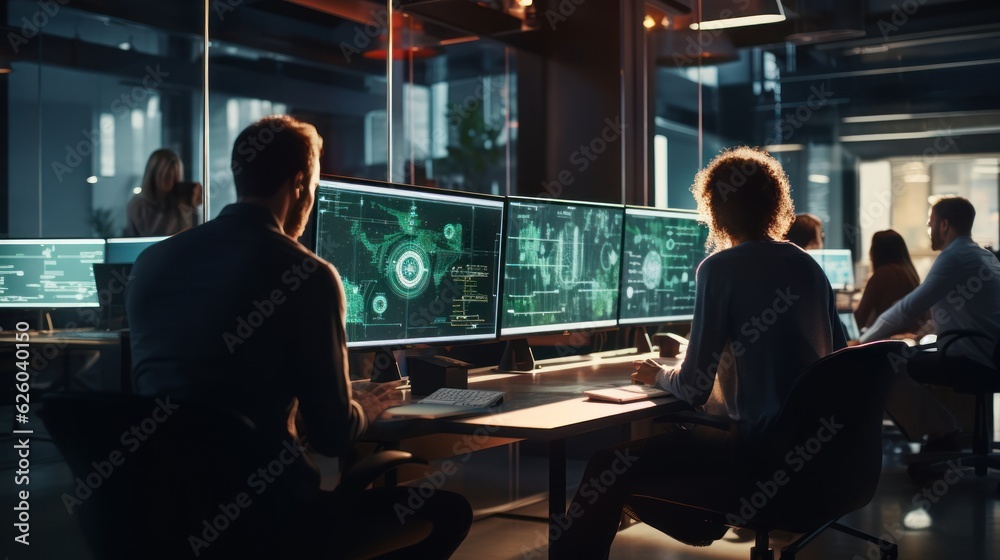 Wall mural a scene showcasing a team of software developers coding, collaborating, and testing applications in  - Wall murals Wall mural a scene showcasing a team of software developers coding, collaborating, and testing applications in - Wall murals