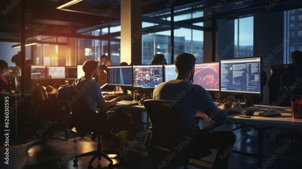Wall mural a scene showcasing a team of software developers coding, collaborating, and testing applications in  - Wall murals Wall mural a scene showcasing a team of software developers coding, collaborating, and testing applications in - Wall murals