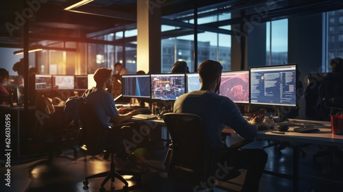 Wall mural : A scene showcasing a team of software developers coding, collaborating, and testing applications in