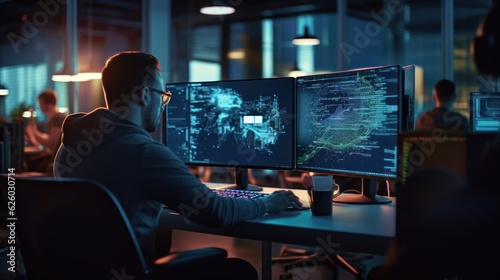 Wall mural a scene showcasing a team of software developers coding, collaborating, and testing applications in  - Wall murals Wall mural a scene showcasing a team of software developers coding, collaborating, and testing applications in - Wall murals