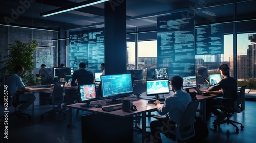 Wall mural a scene showcasing a team of software developers coding, collaborating, and testing applications in  - Wall murals Wall mural a scene showcasing a team of software developers coding, collaborating, and testing applications in - Wall murals