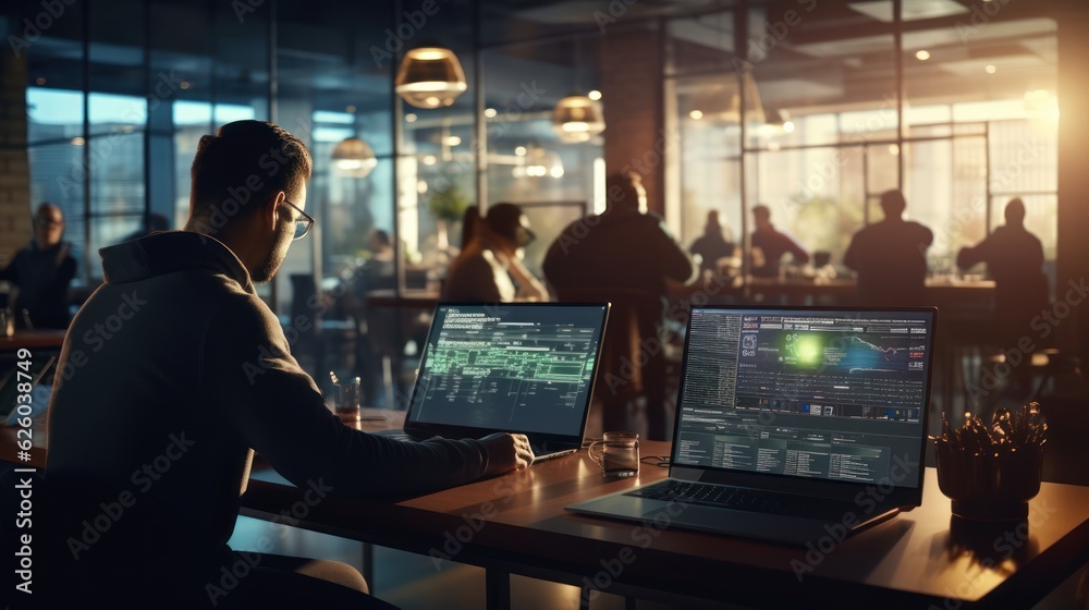 Wall mural a scene showcasing a team of software developers coding, collaborating, and testing applications in  - Wall murals Wall mural a scene showcasing a team of software developers coding, collaborating, and testing applications in - Wall murals
