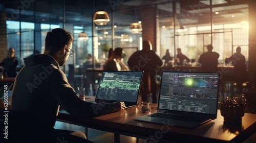 Wall mural : A scene showcasing a team of software developers coding, collaborating, and testing applications in