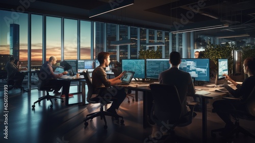 Wall mural a scene showcasing a team of software developers coding, collaborating, and testing applications in  - Wall murals Wall mural a scene showcasing a team of software developers coding, collaborating, and testing applications in - Wall murals