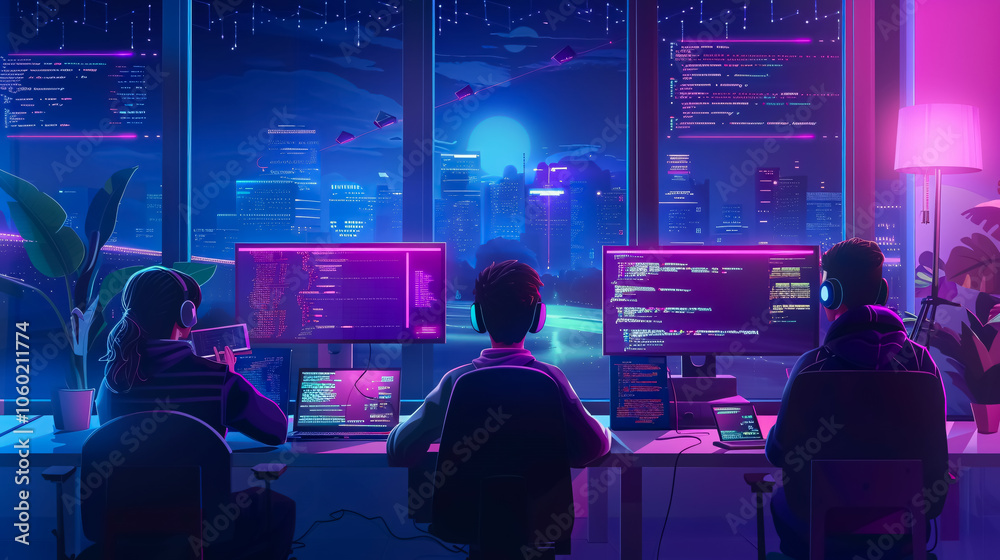 Wall mural : A scene showcasing a team of software developers collaborating, coding, and testing applications in