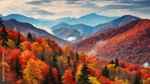 Wall mural a scenic view of a mountain range with colorful trees in the foreground. generative ai