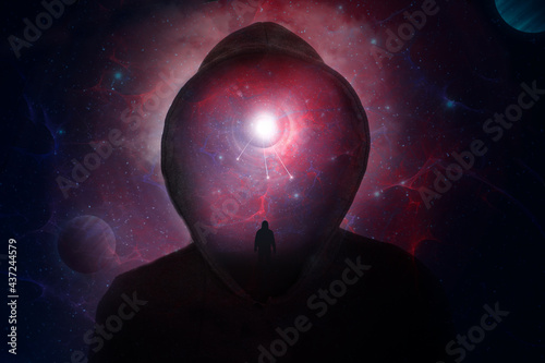 Wall mural a science fiction concept of a hooded figure without a face. over layered with a man looking into a