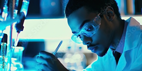 The watermark will not be included on Wall mural.: A scientist writing notes on research data, with laboratory tools in the background, emphasizing the