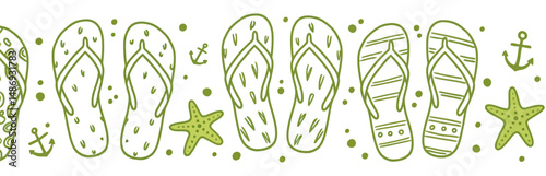 Wall mural a seamless border pattern of green flip flops starfish and anchors on a white background in a row de