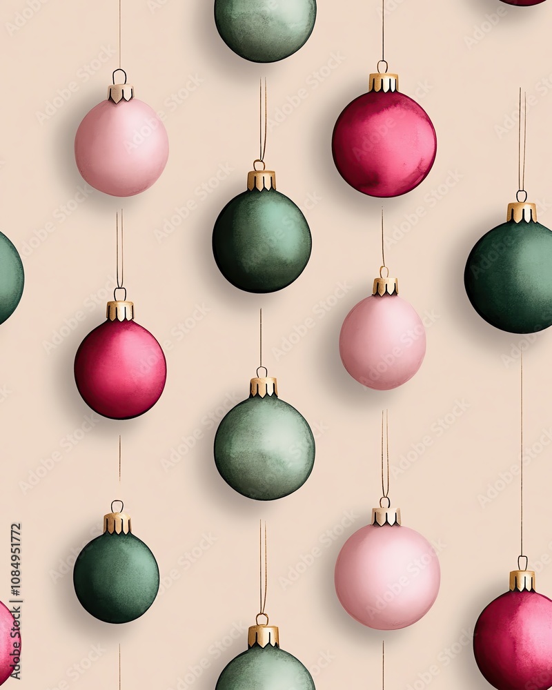 The watermark will not be included on Wall mural.: A seamless pattern colorful christmas ornaments hung on a light background create a festive atmosphe