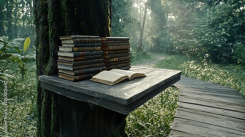 The watermark will not be included on Wall mural.: A serene forest scene with a wooden shelf holding stacked books and an open book, illuminated by sof