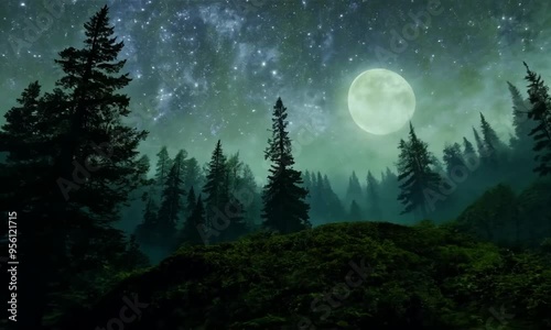 Wall mural a serene forest under a starry sky. the moonlight filters through the dense trees, casting soft shad