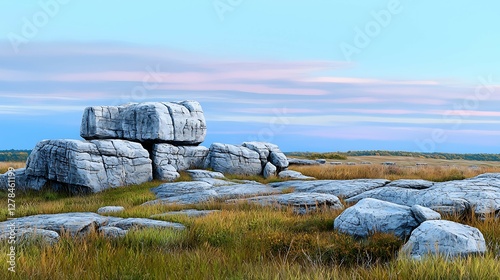 Wall mural : A serene landscape featuring large rock formations amidst grassy fields under a soft blue sky, creat
