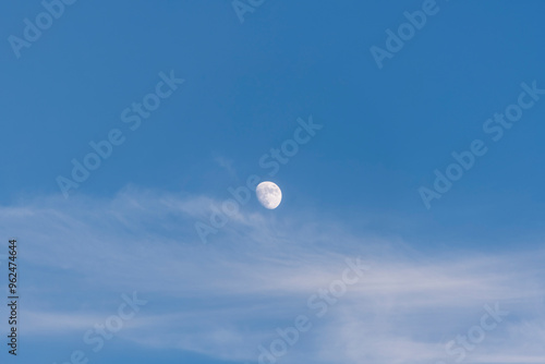 The watermark will not be included on Wall mural.: A serene moon captured in a blue daytime sky with soft clouds, conveying calm and peace -