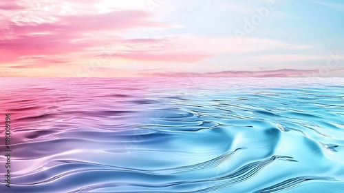 Wall mural : A serene ocean scene with gentle waves reflecting a pastel sky, blending shades of pink and blue, ev