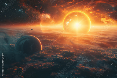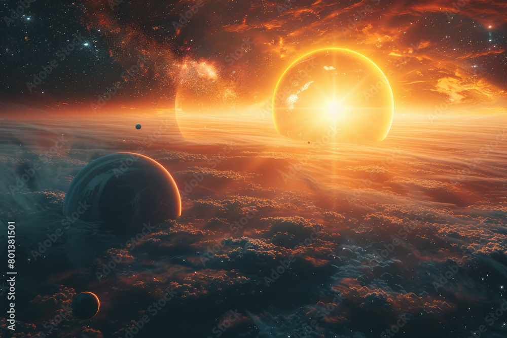 Wall mural a serene scene of an exoplanetary system with multiple habitable planets, each with unique atmospher - Wall murals Wall mural a serene scene of an exoplanetary system with multiple habitable planets, each with unique atmospher - Wall murals