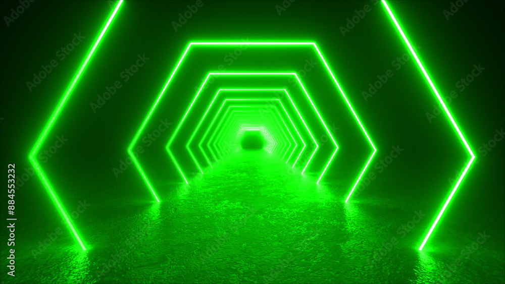 The watermark will not be included on Wall mural.: A series of glowing green neon hexagons form a tunnel that extends into the distance, creating a fut