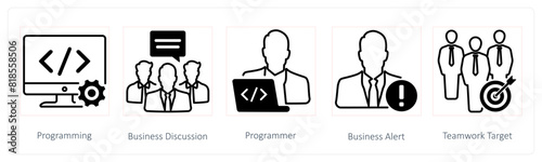 The watermark will not be included on Wall mural.: A set of 5 seo icons as programming, business dicussion, programmer