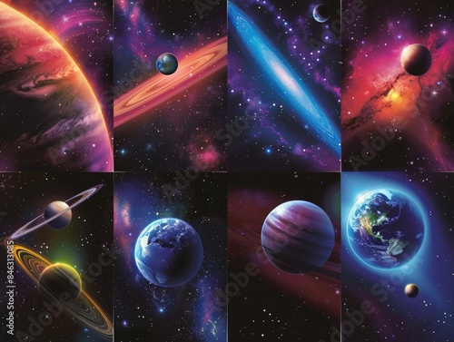 The watermark will not be included on Wall mural.: A set of eight colorful space images with planets and stars
