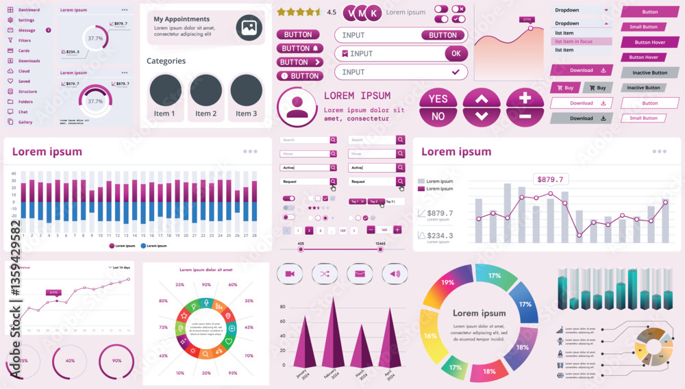 A set of modern interface elements for business applications and websites: buttons, charts, menus, gWall mural