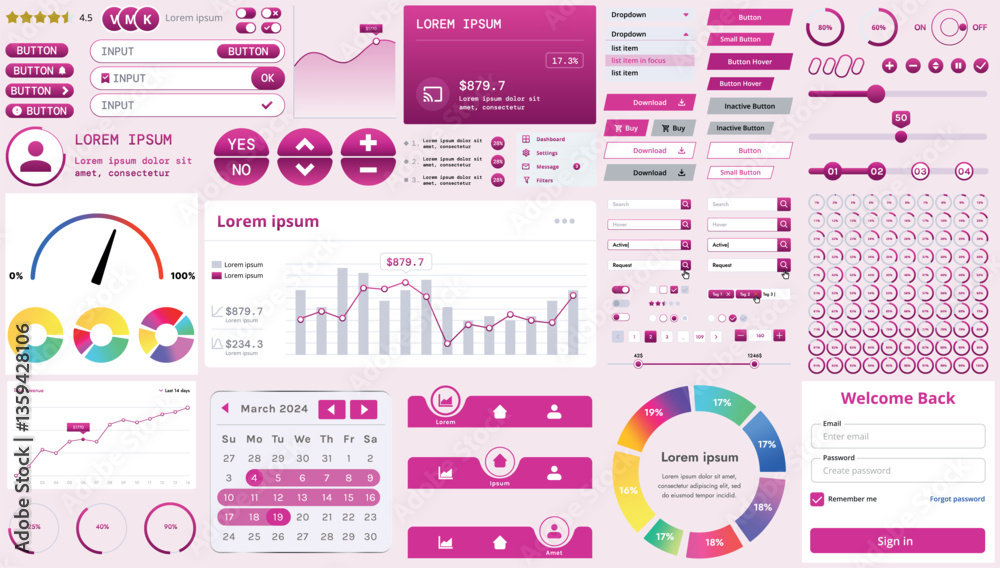The watermark will not be included on Wall mural.: A set of modern interface elements for business applications and websites: buttons, charts, menus, g