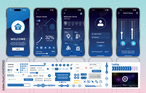 A set of ui ux elements for smart home management mobile apps: an interface with buttons, panels, grWall mural