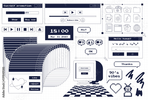 The watermark will not be included on Wall mural.: A set of user interface design elements in 80s, 90s retro style - old computer aesthetics - vintage no