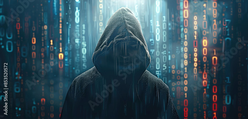 Wall mural a shadowy figure in a hoodie, representing a hacker, standing against a backdrop of binary code. the