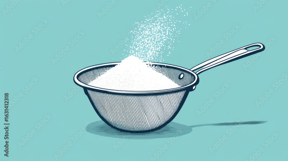 The watermark will not be included on Wall mural.: A sharp, modern vector graphic featuring a medium-sized stainless steel strainer with fine mesh, dep