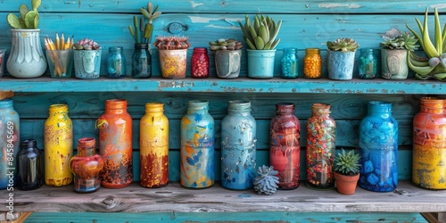 The watermark will not be included on Wall mural.: A shelf adorned with an array of vibrant vases and potted plants