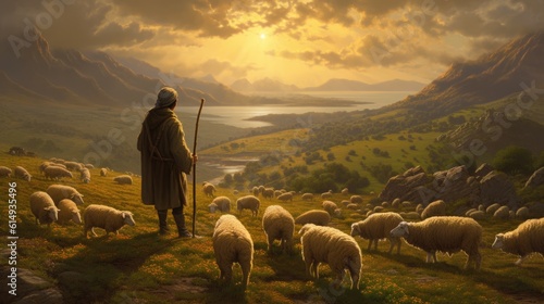 Wall mural a shepherd guiding his flock of sheep generative ai - Wall murals Wall mural a shepherd guiding his flock of sheep generative ai - Wall murals