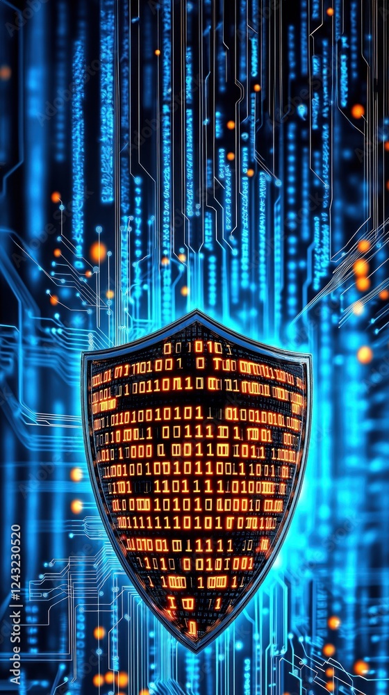 Wall mural a shield made of binary code floats on a circuit board, representing automotive cybersecurity and th - Wall murals Wall mural a shield made of binary code floats on a circuit board, representing automotive cybersecurity and th - Wall murals