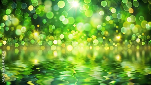 A shimmering green bokeh background with a smooth water reflection reflecting the bright lightsWall mural