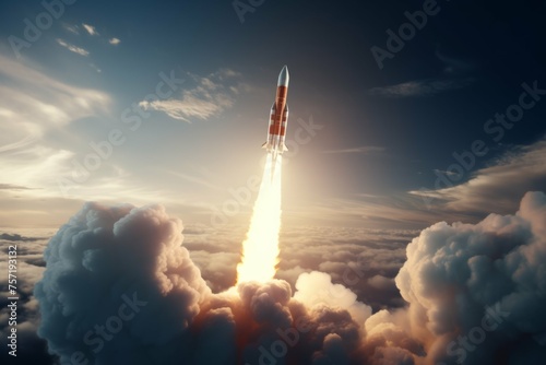 Wall mural a shot of a rocket launching into space, with a bright trail of fire and smoke in its wake