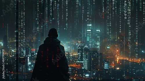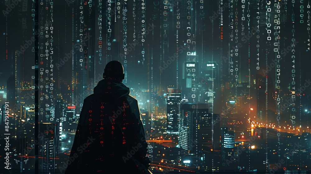 Wall mural a silhouette of a hacker against a backdrop of a cityscape filled with digital data streams and lock