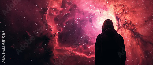Wall mural : A silhouette of a man wearing hoodie against the backdrop of a massive, red and purple galaxy in spa