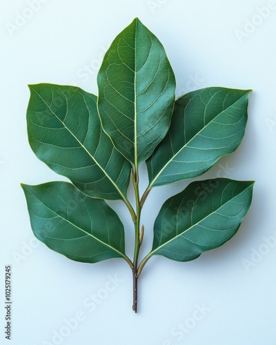 The watermark will not be included on Wall mural.: A single bay leaf with a glossy surface and slightly curved edges, isolated on white background
