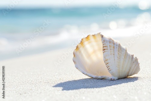 The watermark will not be included on Wall mural.: A single shell on a sandy beach with the ocean waves in the background
