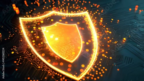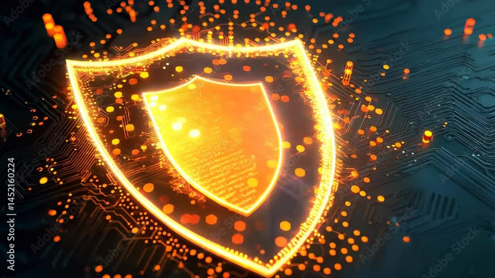 The watermark will not be included on Wall mural.: A sleek digital shield icon set against an abstract background filled with glowing elements - this im