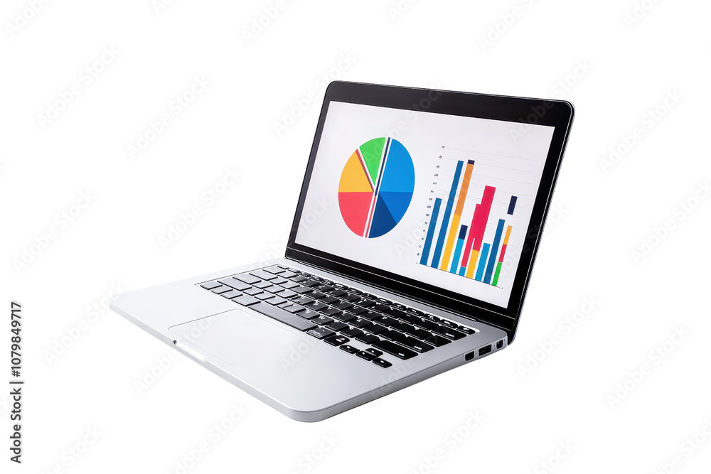Wall mural a sleek laptop displaying a colorful pie chart and bar graphs, showcasing data analysis.