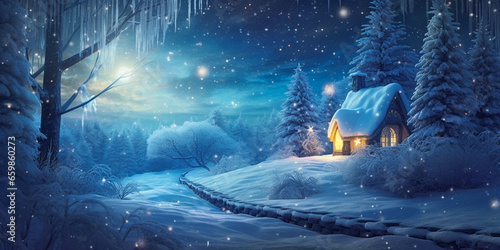 Wall mural : A small fairy tale cottage in a winter snow covered forest illustration, christmas background with w