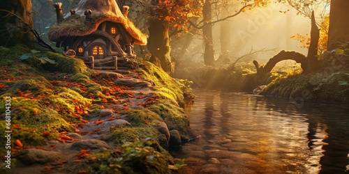 The watermark will not be included on Wall mural.: A small fairy tale house in dark fantasy autumn forest, miniature woodland cottage made by gnomes an