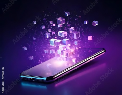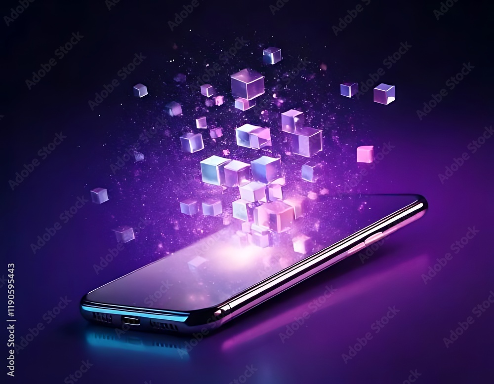 The watermark will not be included on Wall mural.: A smartphone emits floating cubes, representing digital data in a purple space