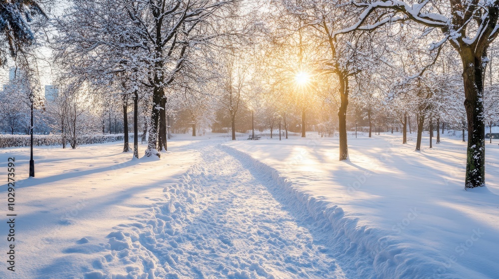 The watermark will not be included on Wall mural.: A snow-covered path through a park, with soft light filtering through the trees in the background