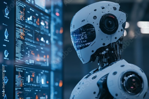 Wall mural a sophisticated ai robot is shown conducting complex data analysis on a large display screen, epitom - Wall murals Wall mural a sophisticated ai robot is shown conducting complex data analysis on a large display screen, epitom - Wall murals
