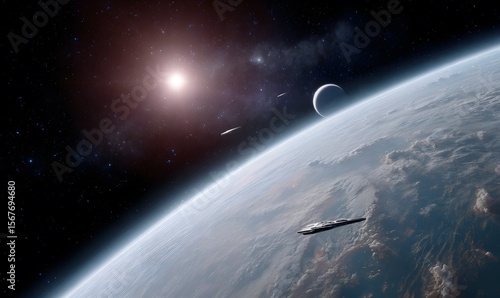 Wall mural a space-based image of an enigmatic solar system with strange planets and futuristic ships gliding t